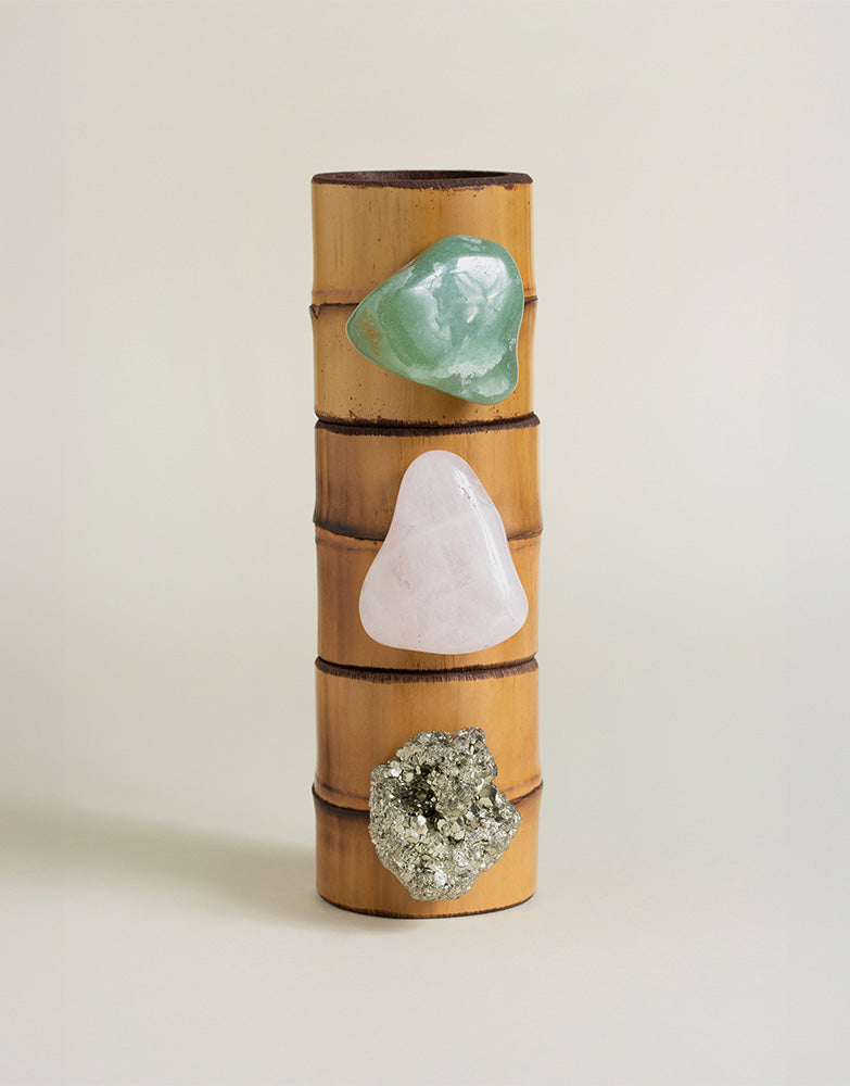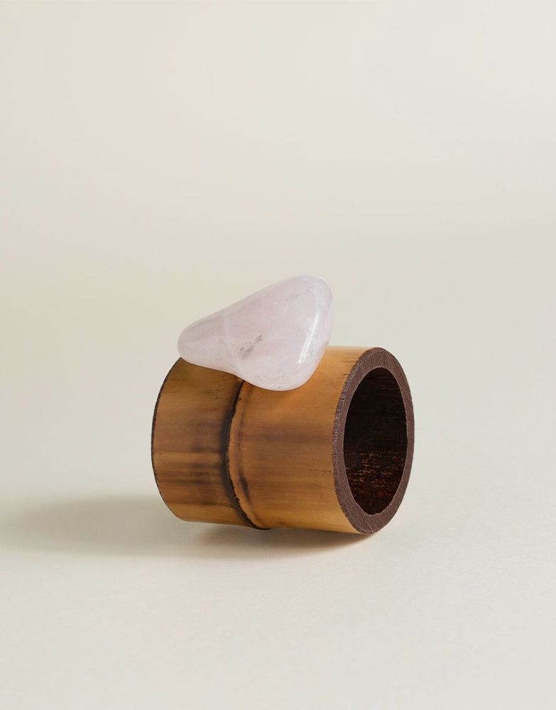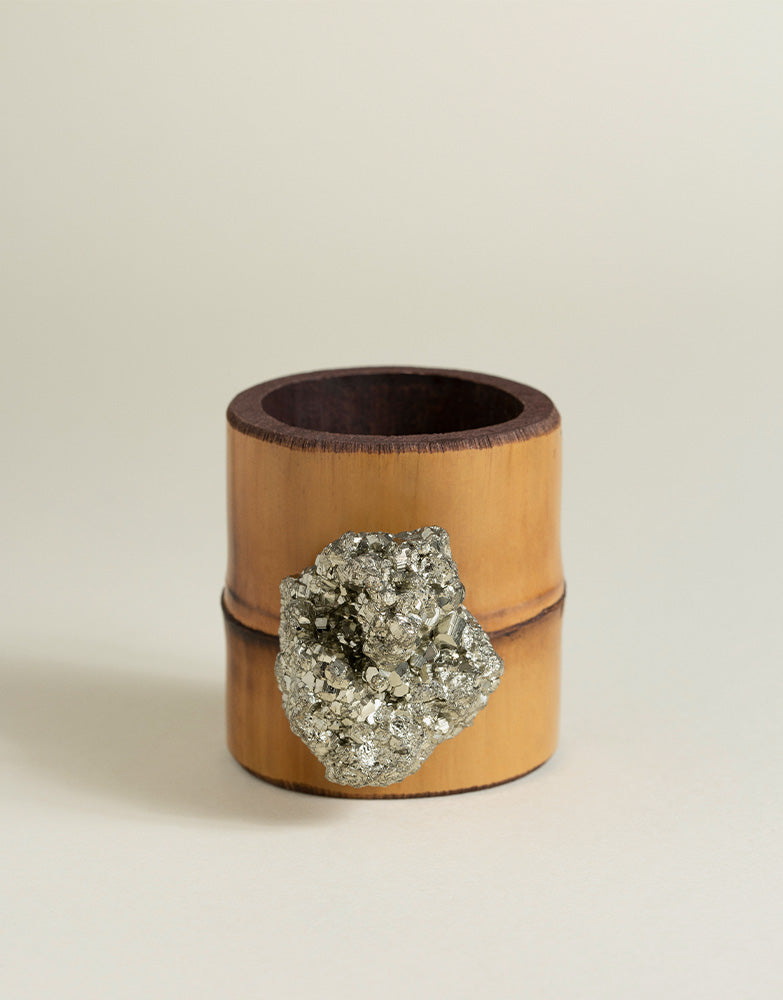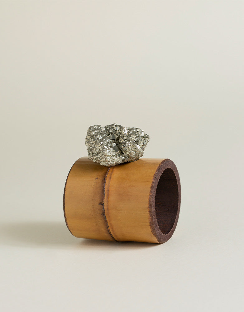 Minimalista e vigorosa, essa coleção revela a beleza pura dos minerais em formas essenciais. Latão, pedra-sabão e cristais naturais como olho de tigre, quartzo rosa, quartzo fumê e pirita se unem com precisão e leveza, exaltando o contraste entre o bruto e o refinado.