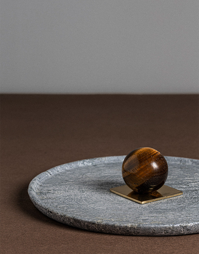 Minimalista e vigorosa, essa coleção revela a beleza pura dos minerais em formas essenciais. Latão, pedra-sabão e cristais naturais como olho de tigre, quartzo rosa, quartzo fumê e pirita se unem com precisão e leveza, exaltando o contraste entre o bruto e o refinado.